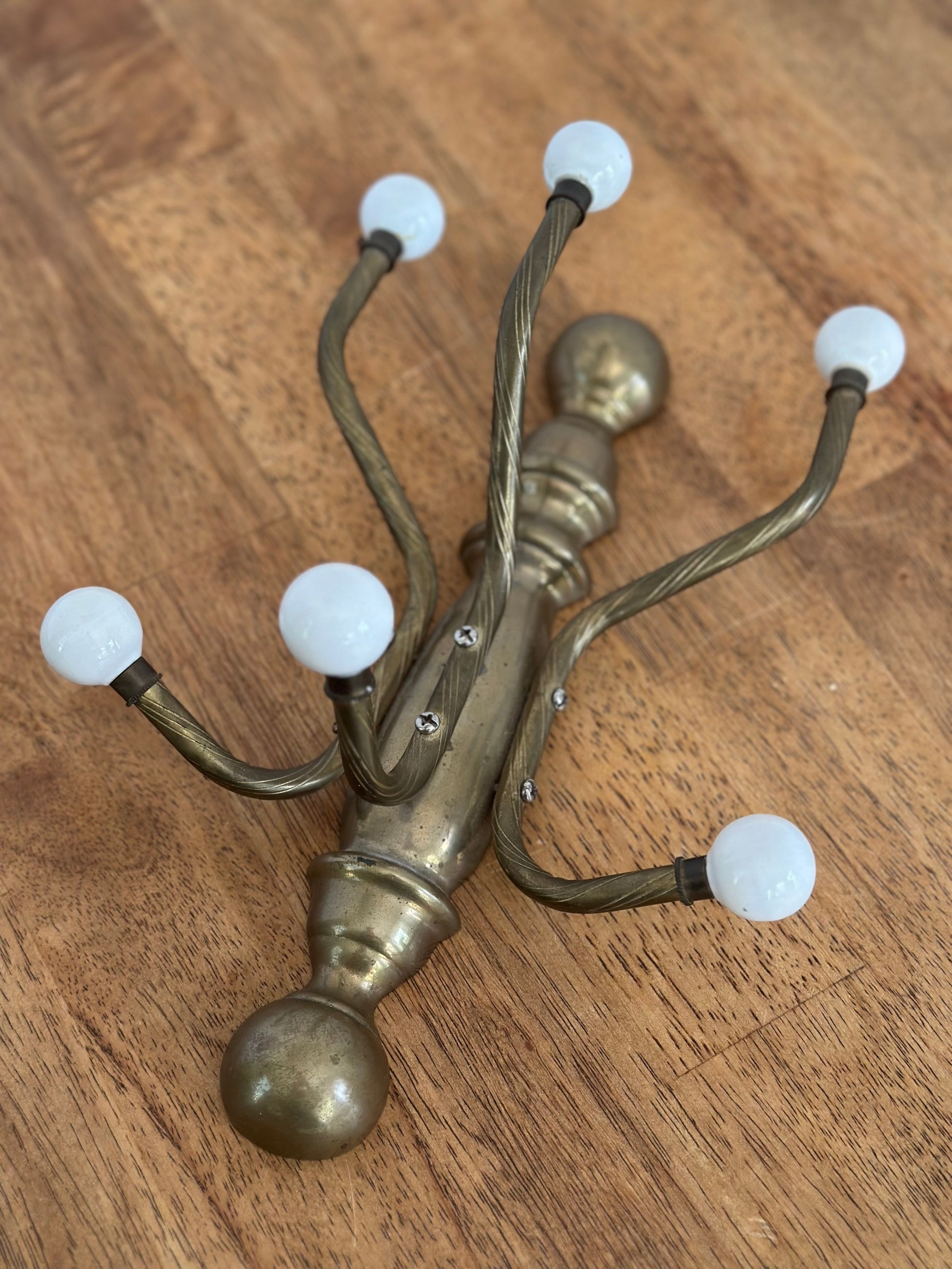 Vintage Brass Wall Mount Coat/Hat Rack With Porcelain Knobs